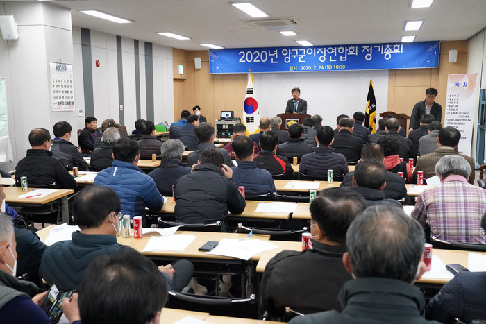 [양구군=세계타임즈 김민석 기자] 이상건양구군의회의장이 24일 DMZ두드림센터에서 열린 양구군 이장연합회 정기총회에서 축사를 하고 있다.
