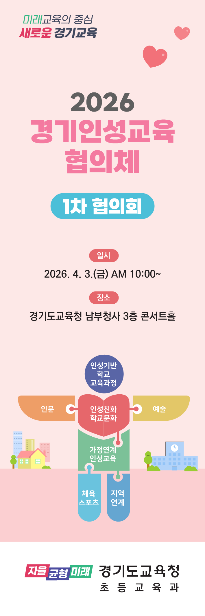 ‘경기인성교육협의체’는 2023년 도교육청 7개 부서와 직속기관으로 구성해 교육 현장의 인성교육 실천을 지원해 온 협의 기구다. 올해에는 모두 13개 부서가 참여해 학교 현장의 통합 지원과 사회정서학습을 연계한 기본 인성교육 안착에 힘쓸 계획이다.