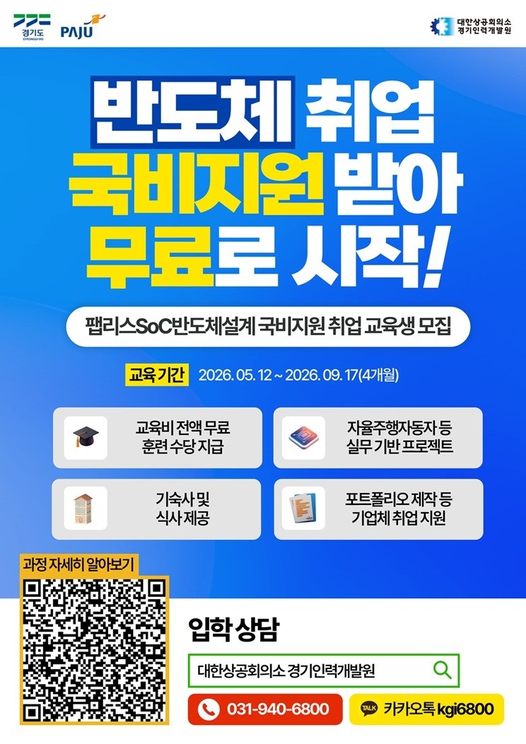 올해 교육 예정인 ’팹리스 에스오시(SoC) 반도체 설계‘ 모집 인원은 18명이며, 미취업 경기도민(파주시민 우대)이면 누구나 신청이 가능하다. 신청은 5월 11일까지 대한상공회의소 경기인력개발원 누리집(https://kg.korchamhrd.net)을 통해 가능하다.