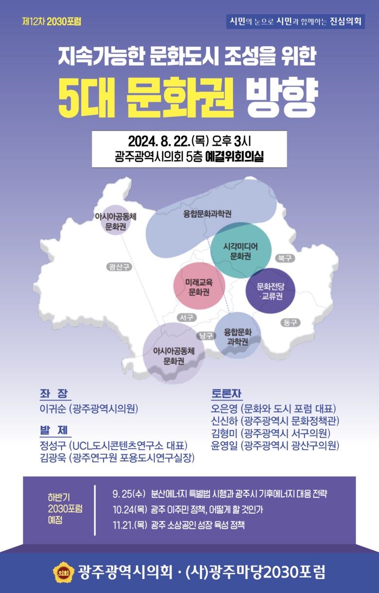 22일 15시, 광주광역시의회 5층 예결특위회의실 [광주 세계타임즈=손권일 기자] 광주광역시의회 이귀순 의원(더불어민주당, 광산구4)은 22일 오후 3시, 광주광역시의회 5층 예결특위회의실에서 “지속가능한 문화도시 조성을 위한 ‘5대 문화권’ 방향”을 주제로 2030 포럼과 함께 정책토론회를 개최한다고 밝혔다.