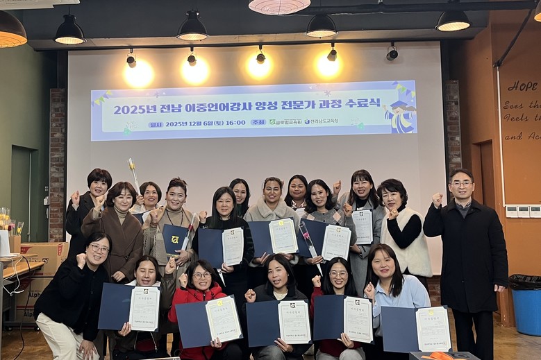 이와 관련, 전남교육청은 ‘2025 전라남도 이중언어강사 전문가 과정 연수’를 11월 15일부터 운영하고, 지난 12월 6일과 7일 전남대학교 여수캠퍼스 글로벌교육원에서 수료식을 열어 연수 과정을 마무리했다.