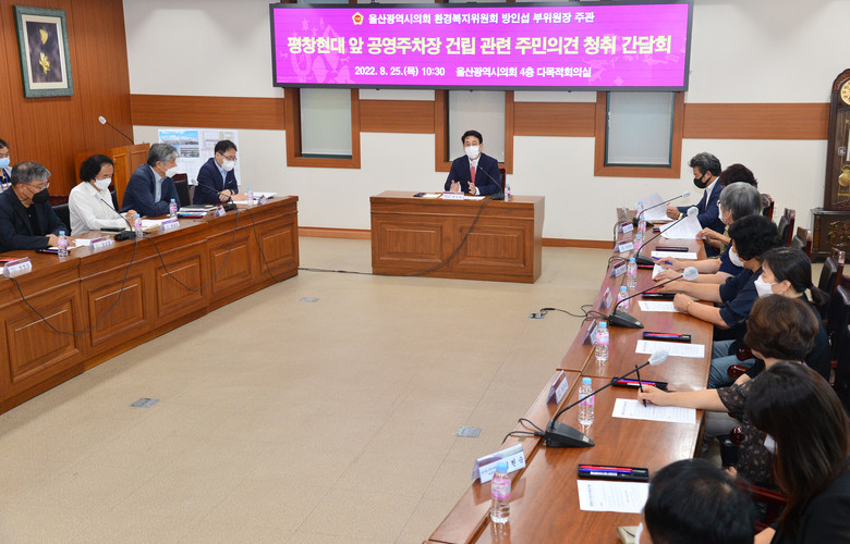 [울산 세계타임즈=이호근 기자] 울산광역시의회 방인섭 의원(환경복지위원회 부위원장)은 25일 오전 10시 30분, 시의회 4층 다목적회의실에서 평창현대 앞 공영주차장 건립에 따른 주민 의견 청취를 위한 간담회를 개최했다.