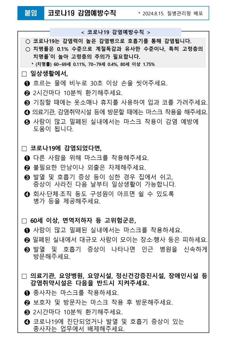 ◈ 감염세 심화, 질병관리청에서 기존 호흡기감염병 예방수칙 외 코로나19 감염예방수칙 배포