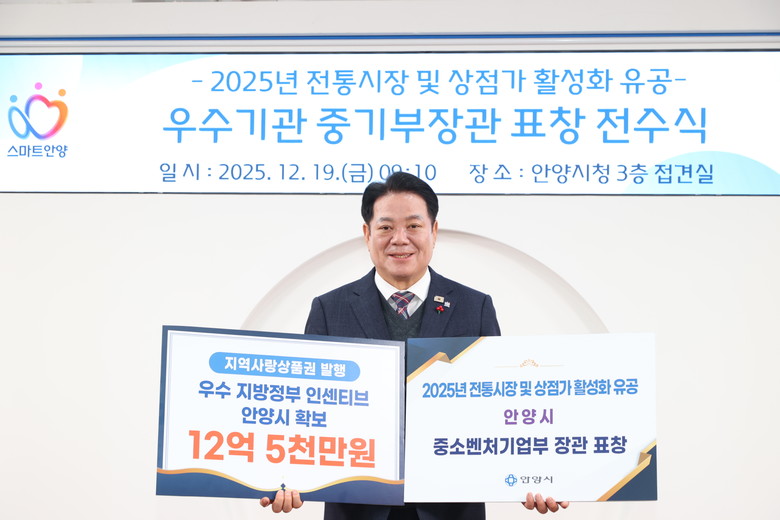 [안양시 세계타임즈=송민수 기자] 안양시(시장 최대호)는 중소벤처기업부가 주관한 ‘2025년 전통시장 및 상점가 활성화 유공’ 포상에서 우수 지자체로 선정돼 중소벤처기업부 장관 표창을 수상했다고 19일 밝혔다.