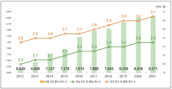 현재 경남의 의과대학 정원은 인구 만 명당 0.23명으로 전국 평균 0.59명을 훨씬 밑돌고, 인구 천 명당 의사 수가 2021년 기준 2.5명으로 전국 3.1명에도 못 미친다. 심지어 도내 18개 시·군 중 14개 지역이 응급의료취약지로 지정되어 있으며, 경남의 미충족의료율*은 2020년 8.4%(전국 1위), 2021년 7.2%(전국 2위)로 전국에서 가장 높다.