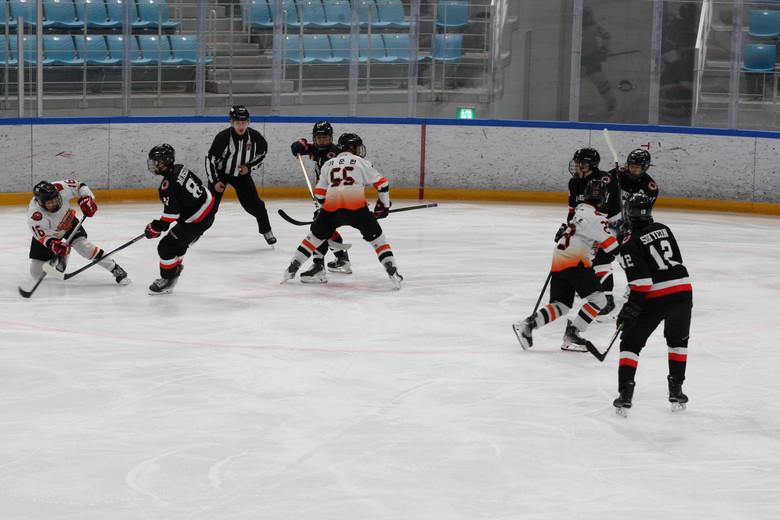 | ▲26일 강릉 하키센터에서 경기도(분당중)와 서울(중동중)의 15세 이하 단체전 준결승 경기가 열리고 있다.선취점은 분당중(6번) 이지섭이 올렸으며 이날 경기도는 서울을 6대2로 꺾고 결승에 진출했다. |