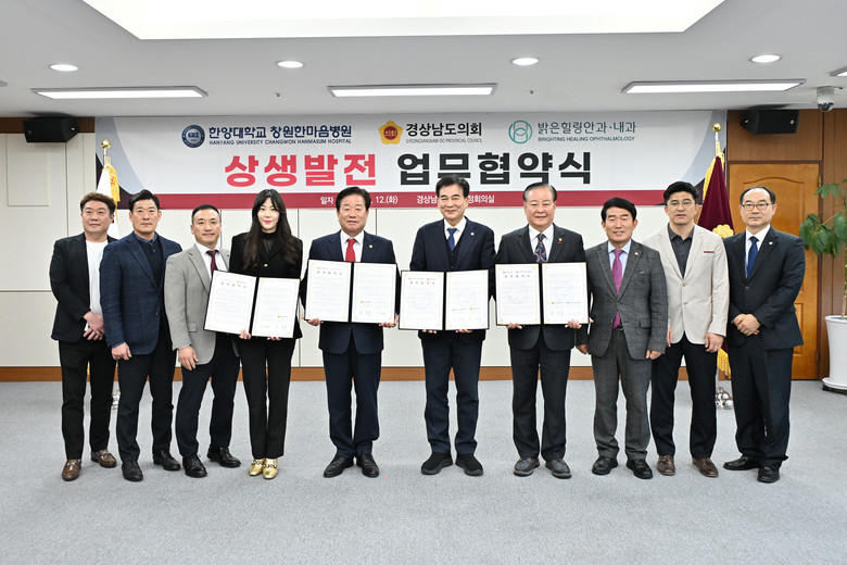 [경남 세계타임즈=한윤석 기자] 경상남도의회(의장 김진부)와 창원한마음병원(이사장 하충식), 밝은힐링안과내과(대표원장 김창현)는 12일 도의회 의정회의실에서 도의원과 의회사무처 직원에 대한 진료비 할인을 골자로 하는 업무협약을 체결했다.