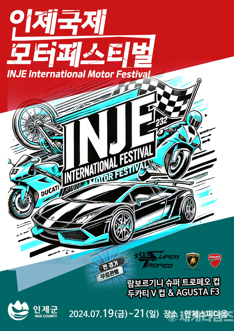 ㈜인제스피디움(대표: 이승우)은 올해부터 국제무대를 겨냥한 축제형 이벤트 ‘인제 국제 모터 페스티벌’의 창설전을 오는 7월 20일부터 21일까지 진행한다고 밝혔다. 첫 인제 국제 모터 페스티벌은 국제 슈퍼카 레이스인 ‘람보르기니 슈퍼 트로페오 아시아’, 바이크 레이스인 ‘두카티 코리아 V컵’과 ‘MV 아구스타 F3컵’이 함께 열리는 모터스포츠 행사다.