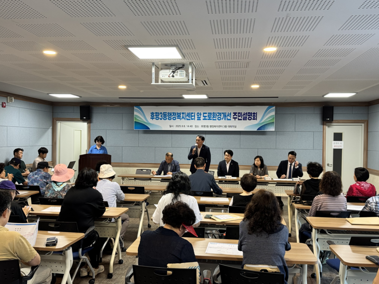 [강원도 세계타임즈=김민석 기자] 박기영 강원특별자치도의원이 9월 8일(월) 후평3동 행정복지센터 3층 대회의실에서 “후평3동 행정복지센터 앞 도로 환경 개선 주민설명회”를 열고, 후평3동 행정복지센터 인근 도로 환경 개선 사업을 위한 도비 지원을 약속했다.