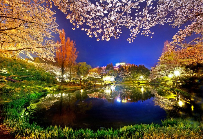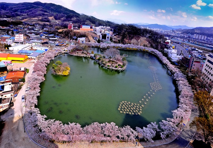 ▲ 김천에는 교동 연화지 둘레길이 SNS 입소문을 통해 널리 알려져 있다. 김천시에 따르면 연화지 벚꽃은 하늘에서 내려다 본 가장 아름다운 벚꽃이라고 한다.