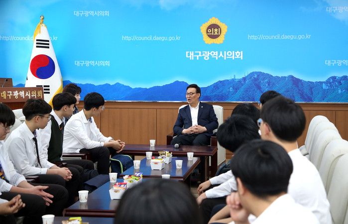 [대구=세계타임즈 한성국 기자] 대구시의회 이시복 의원은 5월 8일(수), 모교인 달성고 정치경제토론반 학생 21명을 시의회에 초대하여 선후배간 대화의 시간을 가진 후, 의회 시설을 둘러보며 의회의 현황 및 역할 등에 대해 설명해 주었다.