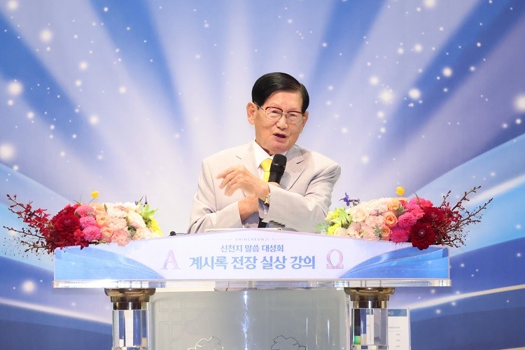 이날 신천지예수교회 이만희 총회장은 강연자로 직접 나서 ‘계시록 전장 실상’을 주제로 말씀을 전했다. 이 총회장은 요한계시록의 전장을 한 장씩 짚어가며 예언의 의미와 그 실체를 함께 설명했다.