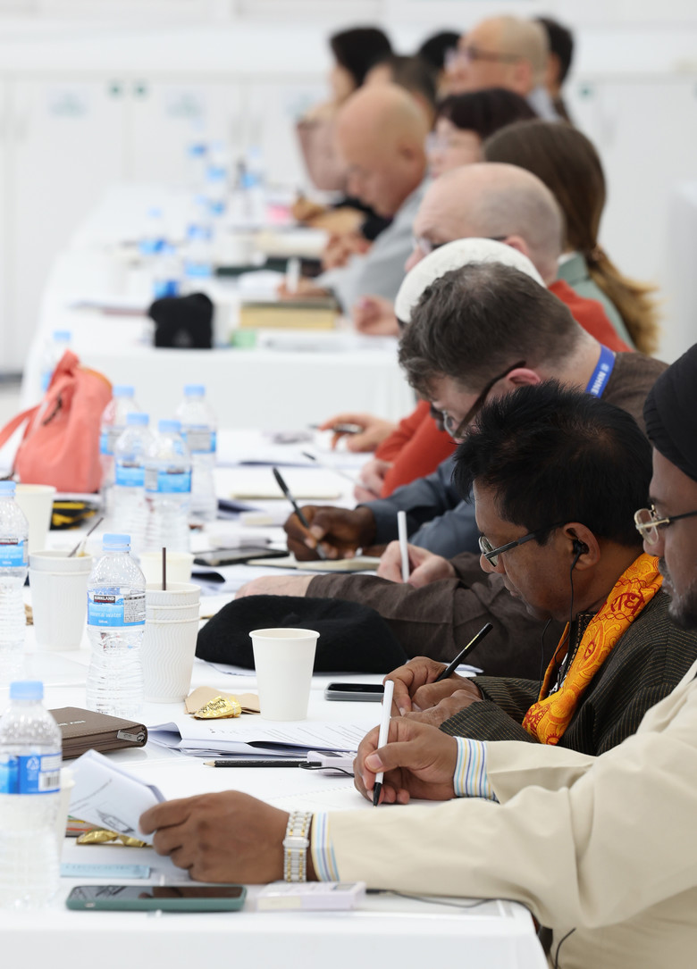 | ▲지난 21일 신천지예수교회가 '제1기 만국초청 계시록 특강'을 실시한 가운데 참석한 종교지도자들이 강의 내용을 필기하는 모습. |