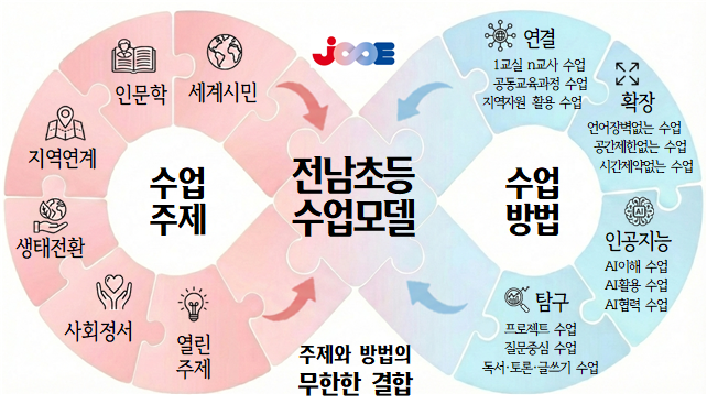 특히, ‘2024 대한민국 글로컬 미래교육 박람회’ 글로컬 미래교실에서 운영한 59시간의 수업과 2025학년도에 운영한 133개 2030교실의 실제 수업 사례를 분석‧정리해 현장 활용도를 높였다. 전남교육이 지향하는 ‘공생하는 글로컬 전남교육’의 방향을 반영한 ‘전남 초등 수업모델’을 개발해, 지역·학교·학급·학생의 여건에 따라 수업 주제와 방법을 유연하게 조합할 수 있도록 했다. 이를 통해 교사들이 각자의 교육철학을 담은 수업브랜드를 2030교실에서 구현할 수 있을 것으로 기대된다.