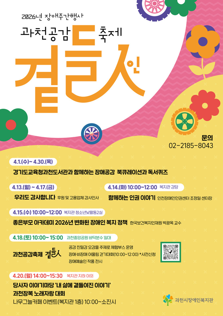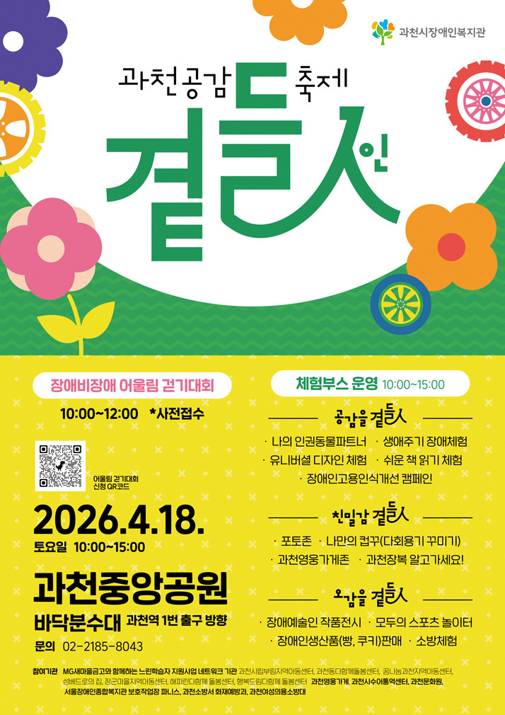 한편, 과천공감축제 ‘곁들人’과 관련한 프로그램 신청 및 자세한 내용은 과천시장애인복지관 홈페이지(https://www.happyseed.or.kr) 또는 전화 (02-2185-8043)를 통해 확인할 수 있다.
