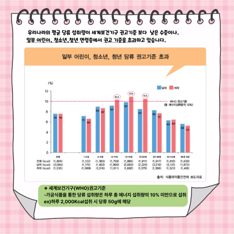 최근 국민건강영양조사 영양소 섭취 통계에 따르면, 당류 섭취는 음료·간식 등 생활습관과 밀접한 관련이 있는 것으로 나타났다. 특히 성장기에는 간식과 음료 선택이 습관화되기 쉬워, 개인의 노력뿐 아니라 가정·학교·지역사회의 식생활 환경 개선이 중요하다는 점이 시사된다.