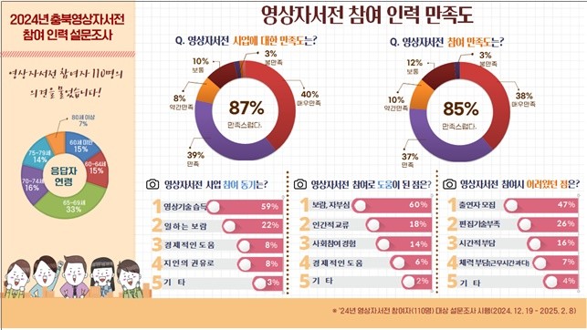 참여자 대상 만족도 조사에는 전체 245명 중 110명(45%)이 참여했고, 사업 참여의 동기를 묻는 질문에 ‘영상기술을 배우기 위해서’ 59%, ‘일하는 보람을 느끼기 위해서’ 22% 순으로 답변했다. 사업 참여로 인해 도움이 된 것에 대한 답변으로는 ‘도민의 인생을 기록하는 사업 참여에 대한 자부심’ 60%로 가장 큰 비중을 차지했으며, ‘인간적 교류’ 18%, ‘사회참여’ 14% 순으로 나타났다. 또한, 사업 수행 중 가장 어려웠던 점에는 ‘출연자를 모집하는 것’ 47%, ‘편집 기술의 부족’ 26%, ‘시간적 부담’ 16% 순으로 답변했다,