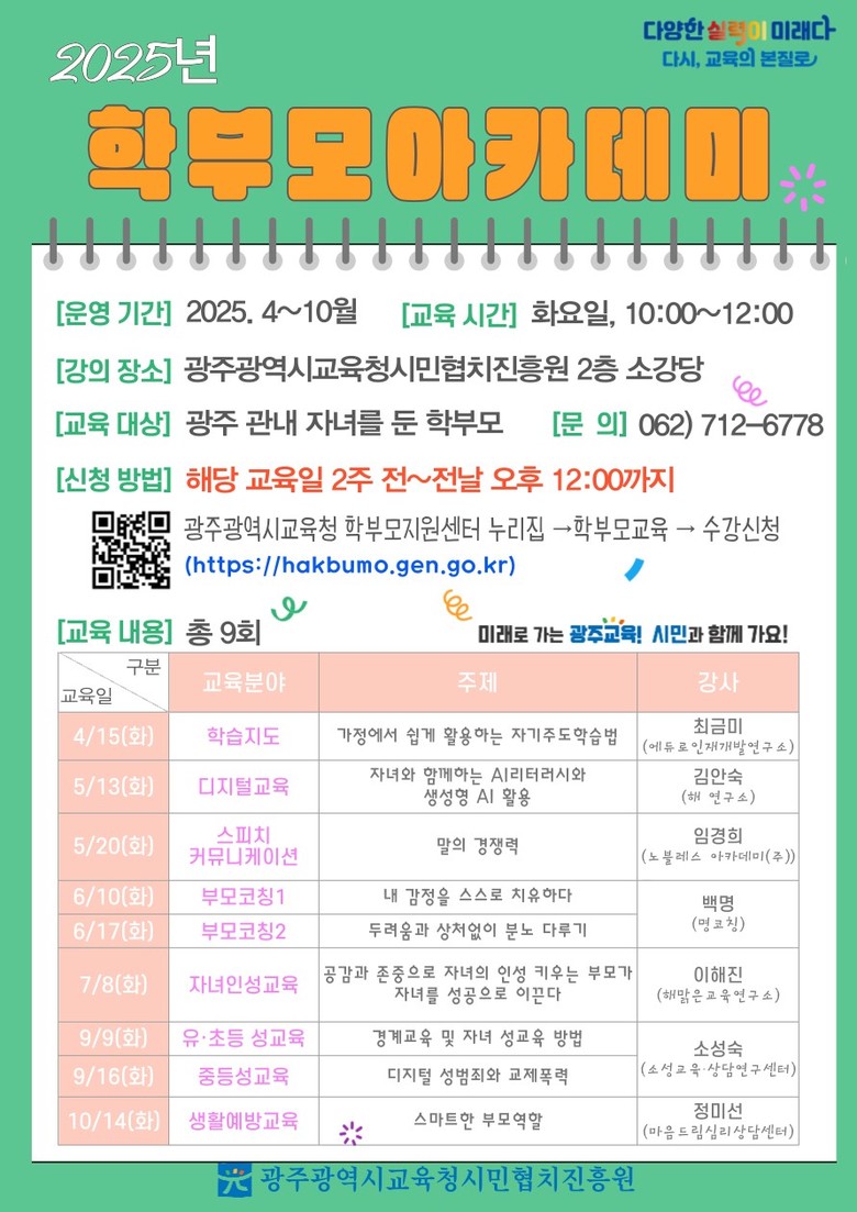 ‘2025년 학부모아카데미’는 학습지도·디지털교육·인성교육 등의 분야에 대한 학부모의 전문성을 키우고, 올바른 자녀교육 가치관이 정립되도록 지원하기 위해 마련됐다.