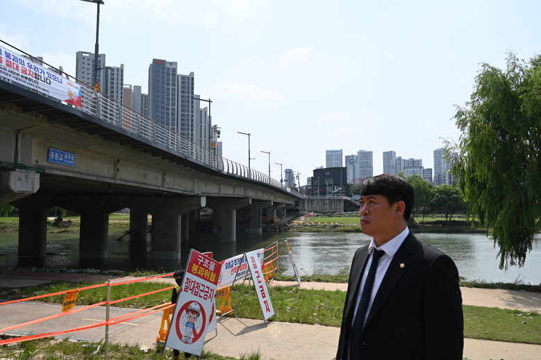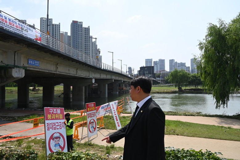 오은규 의장은 장마철 폭우로 인해 교각 상판이 침하해 통행이 전면 제한된 유등교 일원을 12일 방문, 안전조치 및 주민 교통 불편 상황을 파악하고 관련 부서에 신속한 조치를 당부했다.