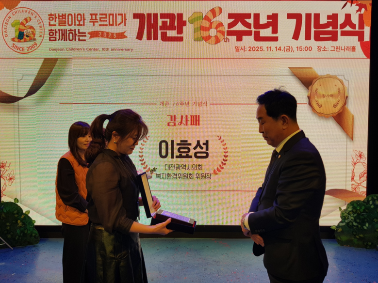 [대전 세계타임즈=이채봉 기자] 대전시의회 이효성 의원(복지환경위원장, 국민의힘, 대덕구1)이 11월 14일 열린 대전광역시어린이회관 개관 16주년 기념식에서 어린이 복지 증진과 회관 발전에 기여한 공로로 감사패를 받았다.