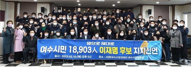 더불어민주당 여수시갑(주철현 위원장) 지역위원회에 따르면 이날 오후 5시 여수시 사)한국수산업경영인 여수시연합회관에서 여수시민 1만 8,903명을 대표해 70여명이 참석한 가운데, 이재명 후보를 지지했다.