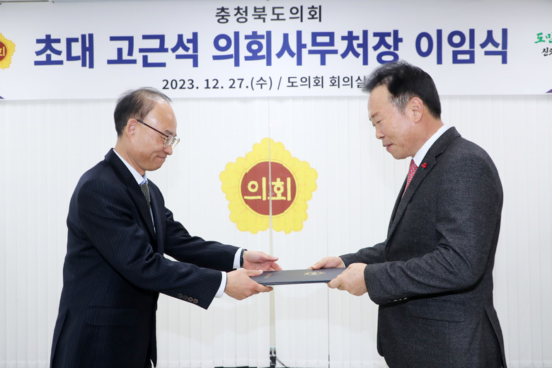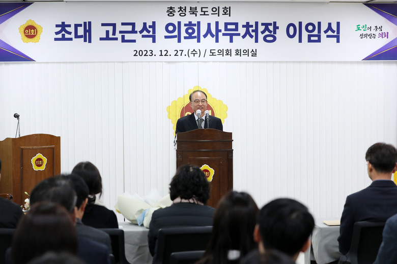 황영호 충북도의회 의장은 이임식에서 “고근석 처장은 성실한 공직 생활을 통해 국가와 충북 발전은 물론 충북도의회의 초석을 마련하는 데 큰 공적을 남겼다”면서 “충북과학기술혁신원장으로 새롭게 시작하는 인생 2막에서도 영광과 보람이 함께하길 기원한다”고 말했다.