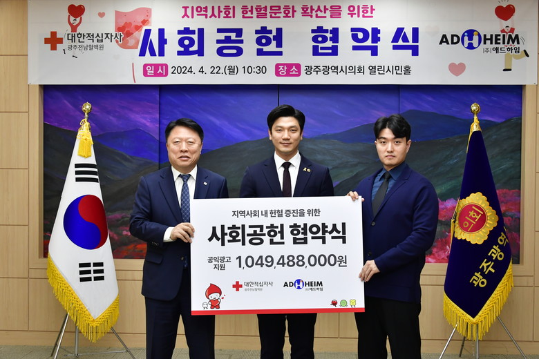 광주광역시의회 이명노(더불어민주당 서구3) 의원, 대한적십자사 광주·전남혈액원 김동수 원장, ㈜애드하임 전유태 대표가 참여한 이번 협약식은 헌혈문화 확산 위한 사회공헌 협약 체결을 위해 마련했다.