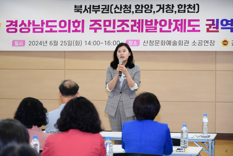[경남 세계타임즈=최성룡 기자] 경상남도의회(의장 김진부)와 시군의회가 함께하는 ‘주민조례발안제도 5개 권역 설명회’ 북서부권(산청,함양,거창,합천) 설명회가 6월 25일 산청군 문화예술회관 소공연장에서 개최되었다.