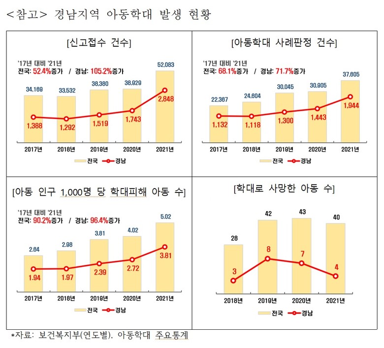 보건복지부에서 발표한 경남지역 아동학대 주요통계를 살펴보면, 아동학대 의심 신고 건수는 2017년 1,388건에서 2021년 2,848건으로 105.2% 증가하였고, 아동학대 판정 건수는 2017년 1,132건에서 2021년 1,944건으로 71.7% 증가한 것으로 나타났다. 같은 기간 전국적으로 신고 건수는 52.4%, 학대판정 건수 68.1% 증가한 것과 비교하면 경남지역의 아동학대 신고 및 판정 건수 증가율은 전국 평균보다 웃도는 것으로 나타났다. 뿐만 아니라 경남지역에서 학대로 사망하는 아동도 매년 끊이질 않는 등 아동학대 문제에 대한 당국의 책임있는 조치가 요구되는 상황이다. <참고: 경남지역 아동학대 발생 현황>