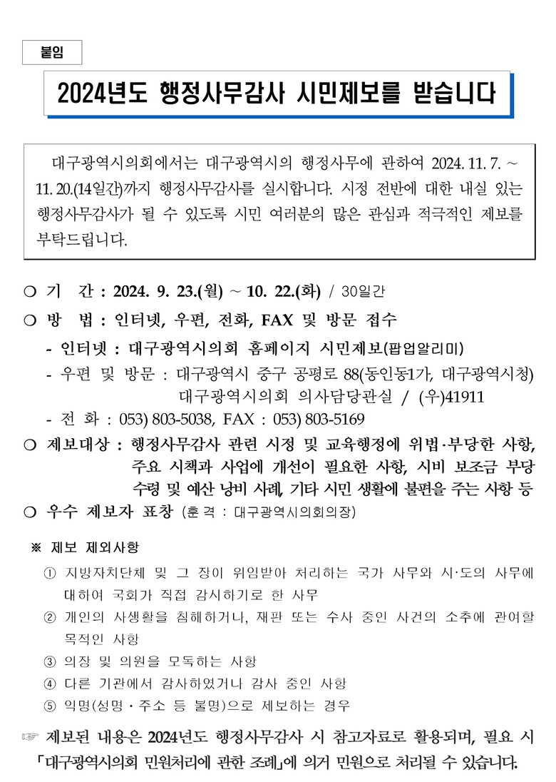 대구시의회는 9월 23일부터 10월 22일까지 30일간 시정과 교육행정의 위법·부당한 사항 및 제도 개선 사항, 예산 낭비 사례, 기타 시민 생활 불편 사항 등 대구시정 전반에 대한 시민들의 제보를 접수받아 2024년도 행정사무감사 시 참고 자료로 활용하고, 제보 내용에 대한 처리 결과를 감사 종료 후 제보자에게 통지할 예정이다.