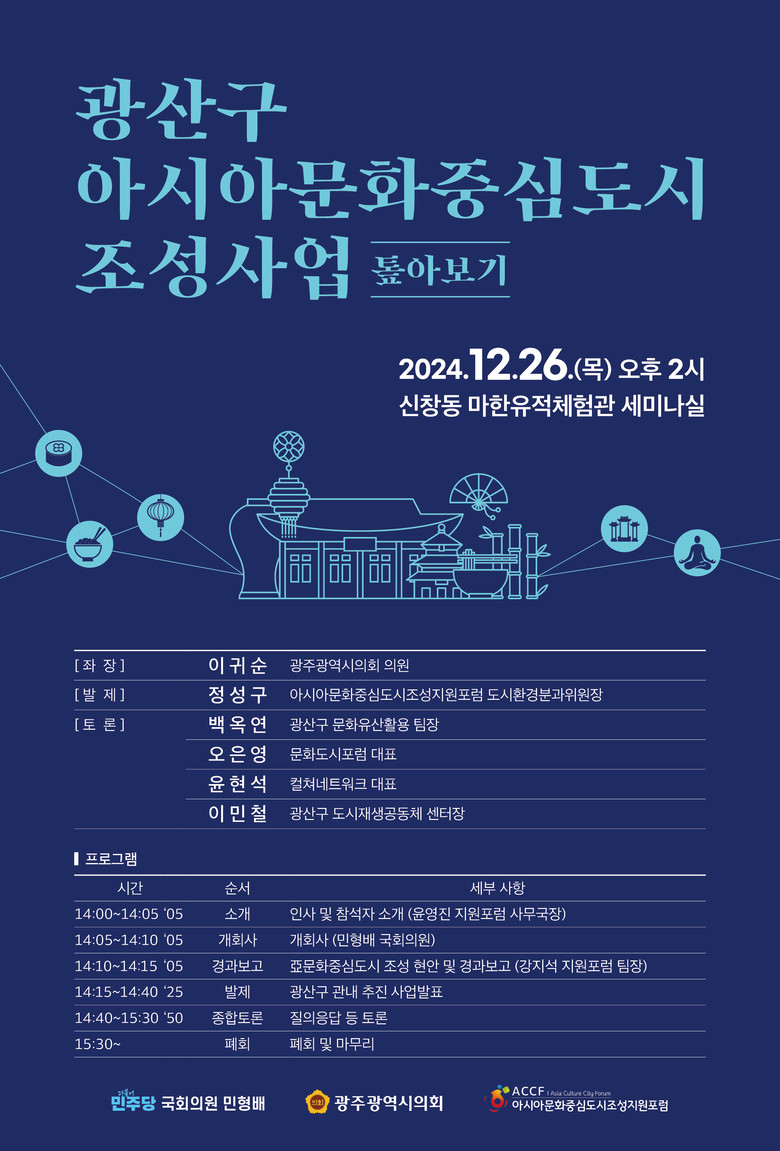 이번 정책토론회에서는 문화체육관광위원회 민형배 국회의원의 개회사를 시작으로 아시아문화중심도시조성사업 현안 등 경과보고와 광산구 관련 주요 사업에 대해서 발표와 토론이 진행된다. 특히 자치구 역할의 중요성을 중점에 두고 시민 모두가 체감할 수 있는 사업의 구체적인 실행 방안을 모색한다.