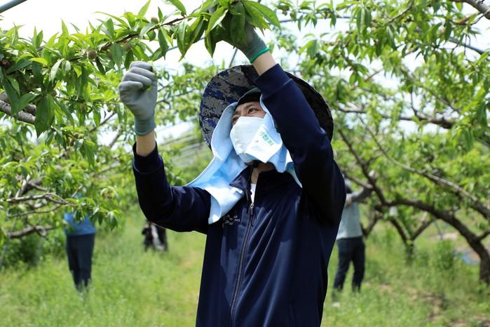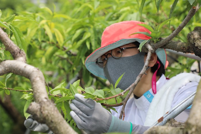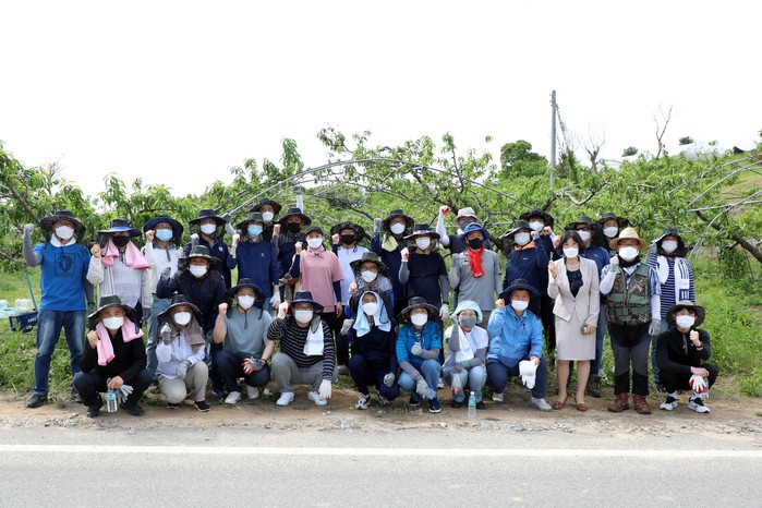 봉사활동 참가자들은 복숭아 농장주와 함께 복숭아 열매솎기 작업을 진행하며 농번기를 맞아 일손이 부족한 농가에 힘을 보탰다.