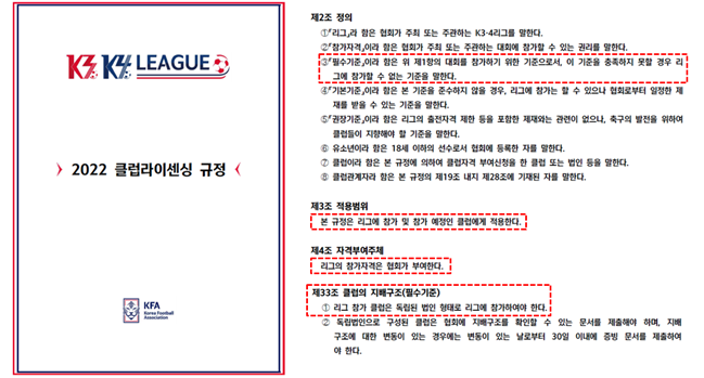 하지만 대한축구협회는 축구발전을 위해 완전 승강제 도입을 목표로 프로리그 리그와 아마추어 리그의 가교 역할을 하는 K3, K4 리그를 출범시켰으며, 리그에 참여하고자 하는 클럽은 클럽라이센싱 규정으로 독립 법인을 의무화하면서 리그 참가에 문제가 발생된 것이다.