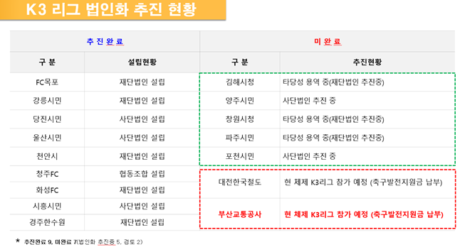 또한 “K3 리그에 활약하고 있는 총 16개 팀 중 9개 팀은 지자체의 발 빠른 조치로 이미 법인화가 완료되었으며, 5팀은 법인화를 추진한 실정임에도 부산시는 여전히 늦장 대응과 책임회피만 하고 있다.”고 지적하였다.