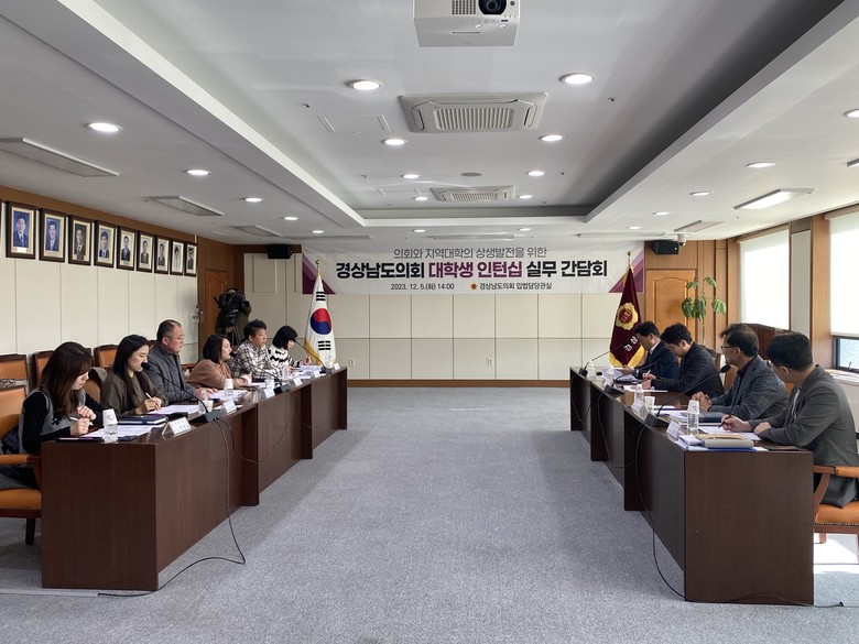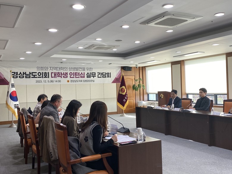 [경남 세계타임즈=최성룡 기자] 경남도의회(입법담당관실)는 12월 5일(14:00~) 도의회 의정회의실에서 도내 6개 대학*과 대학생 인턴십(2024년 여름방학 시행) 추진을 위한 실무간담회를 개최했다.