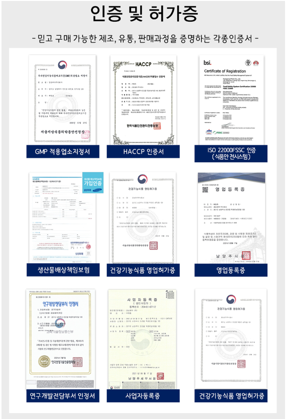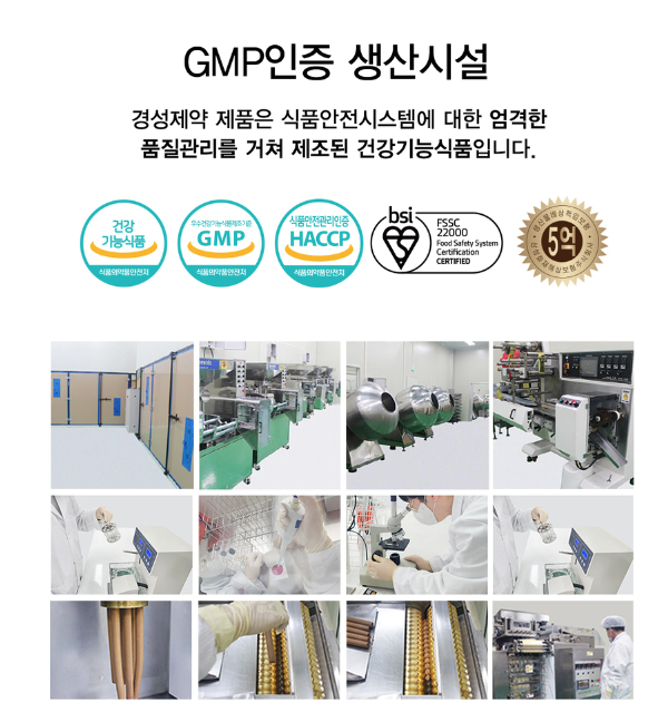 또한 GMP 시설 지정 (지정번호: 제20060028호) 경성제약 제품은 완벽한 GMP시설과 엄격한 품질관리를 거쳐 제조된 건강기능식품이다.