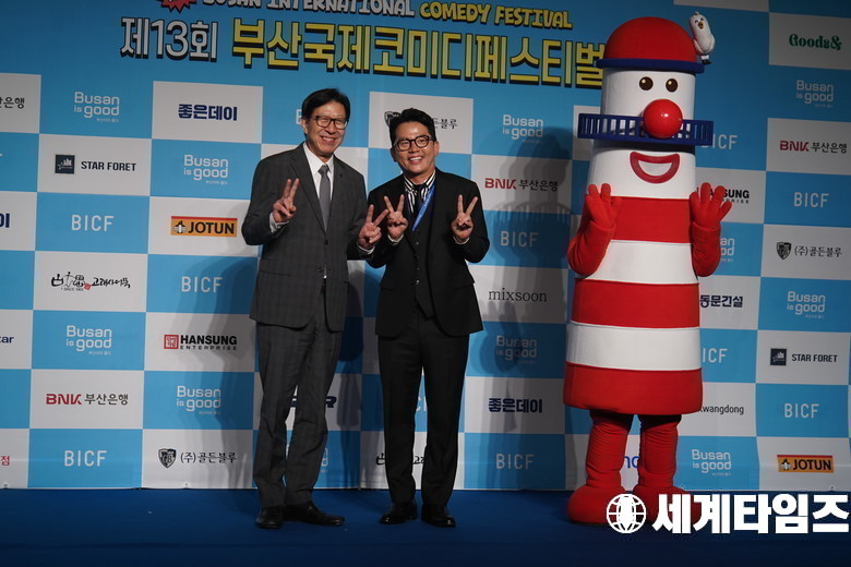 29일 오후 부산 해운대구 벡스코에서 열린 제13회 부산국제코미디페스티벌 개막식에서 '박형준' 부산시장(왼쪽)과 '김준호' 집행위원장(오른쪽)이 블루카펫에 올라 포즈를 취하고있다.