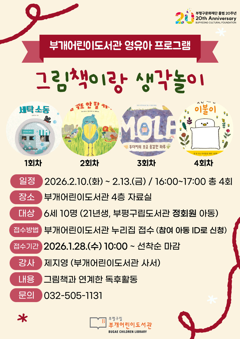 참가 신청은 프로그램별 연령에 맞춰 28일까지 부개어린이도서관 누리집을 통해 선착순으로 접수하며 자세한 사항은 부개어린이도서관 누리집(https://www.bppl.or.kr/bugaech/index.do) 또는 전화(☎505-1131)로 문의하면 된다.