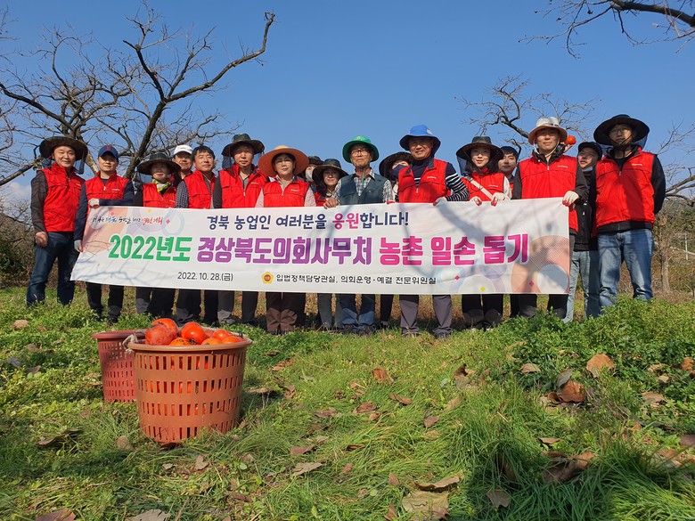 [경북 세계타임즈=한성국 기자] 경상북도의회 이선희(청도) 예산결산특별위원장은 10월 28일 의회사무처 직원 20여명과 함께 청도군 이서면 소재 감 수확 농가를 찾아 농촌 일손 돕기 봉사활동을 펼쳤다.