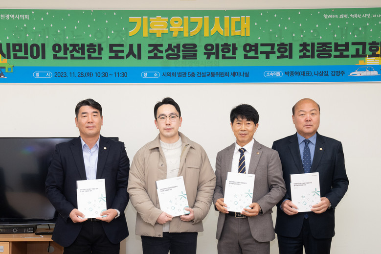 인천광역시의회의원 연구단체인 ‘기후 위기 시대의 시민이 안전한 도시조성을 위한 연구회(대표의원 박종혁)’는 28일 건설교통위원회 세미나실 연구회 박종혁(민·부평6) 대표의원을 비롯해 나상길(민·부평4)·김명주(민·서구6) 의원, 인천연구원 안전도시연구센터 염재원 박사 등이 참석한 가운데 ‘기후위기시대 시민이 안전한 도시조성을 위한 연구회 최종보고회’를 개최했다.