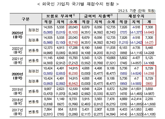 국회 보건복지위원회 소속 국민의힘 김미애 의원이 건강보험공단에서 받은 자료에 따르면 2017∼2023년 전체 재정수지에는 변동이 없으나 보험료 부과액 산정 오류에 따라 공단이 국가별 재정수지를 수정했다.통상 낸 보험료보다 급여 혜택을 더 많이 받는 중국인 가입자에 대한 통계에 오류가 있었던 것이다.