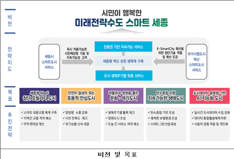 ‘시민이 행복한 미래전략수도 스마트 세종’을 비전으로 설정하고, 이를 실현하기 위해 ▲첨단 모빌리티 도시 ▲포용적 안심도시, ▲문화‧여가 도시 ▲생태도시 ▲AI지능화 도시 등 5대 전략목표 및 추진전략을 마련하여 2029년까지 추진해 나갈 예정이다.