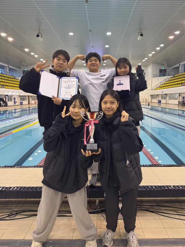 | ▲ 제33회 전국 학생 핀수영대회에서 종합우승을 차지환 핀수영부 선수들(왼쪽 2번째 줄부터 강윤호, 최성연, 윤효정, 김여울, 오수현) |