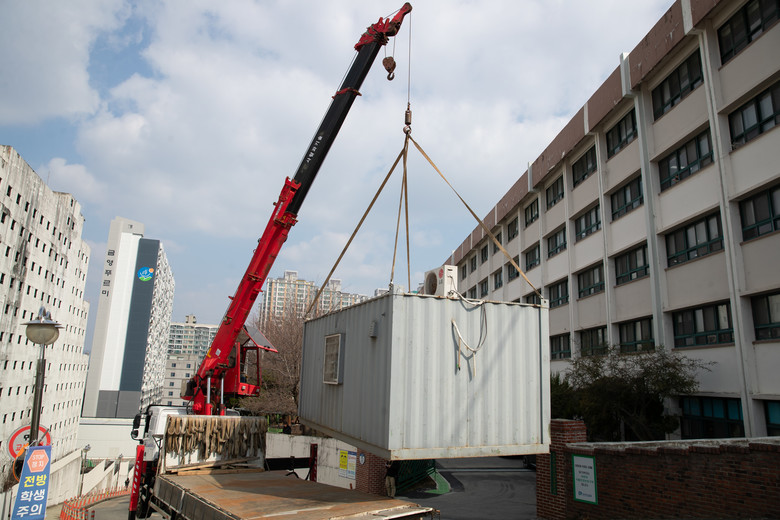| ▲ 대광·서진여고의 통학로를 막고 있었던 콘테이너가 19일 철거되고 있다. |