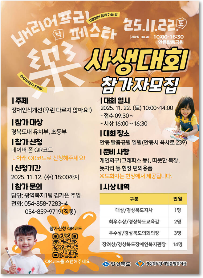 - 온앤오프 가요제, 장애인식 개선 사생대회, 등 다채로운 프로그램 풍성- [세계타임즈=경북 한윤석 기자] 경상북도는 22일 안동 탈춤공원 일원에서 ‘배리어프리 樂(낙)페스타’를 개최한다.