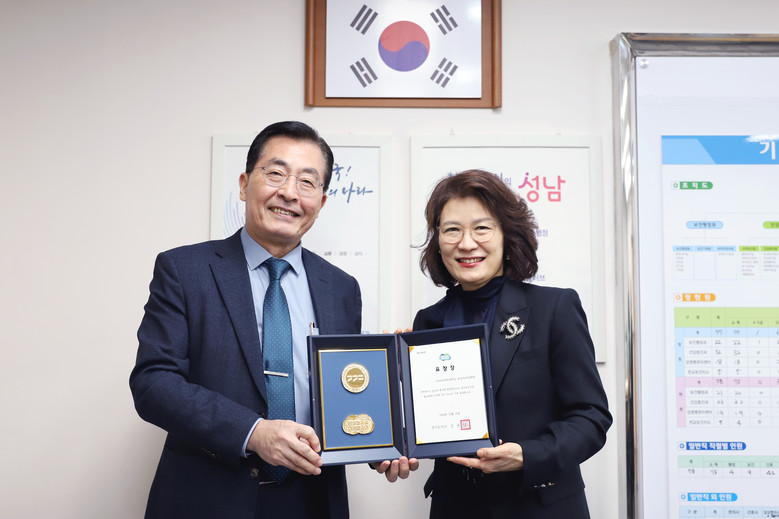 ▲김영탁 분당차여성병원장(왼쪽)이 구성수 분당 보건소장과 함께 경기도지사 표창 기념촬영을 하고 있다.(사진=분당 차병원)