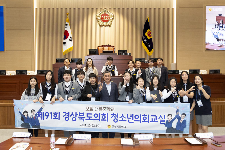 [경북 세계타임즈=한윤석 기자] 경상북도의회(의장 박성만)는 10월 23일(수) 본회의장에서 포항 대흥중학교학생 15명이 참여한 가운데『제91회 경상북도의회 청소년의회교실』을 개최했다.