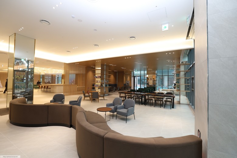 로비 입구에 설치된 대형 LED 전광판이 처음 시설을 들어서는 이용객을 가장 먼저 환영하며, 로비에는 대강당, 회의실(4실), 북카페 등이 자리해 있어 회의·세미나형 체류도 소화할 수 있다.