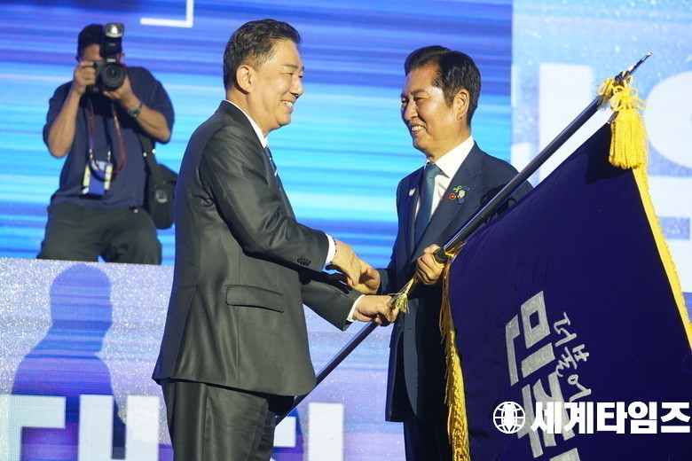 '정청래' 더불어민주당 신임 당대표가 2일 경기 고양시 킨텍스에서 열린 제2차 임시전국당원대회에서 '김병기' 원내대표로 부터 당기를 이양받고 있다.