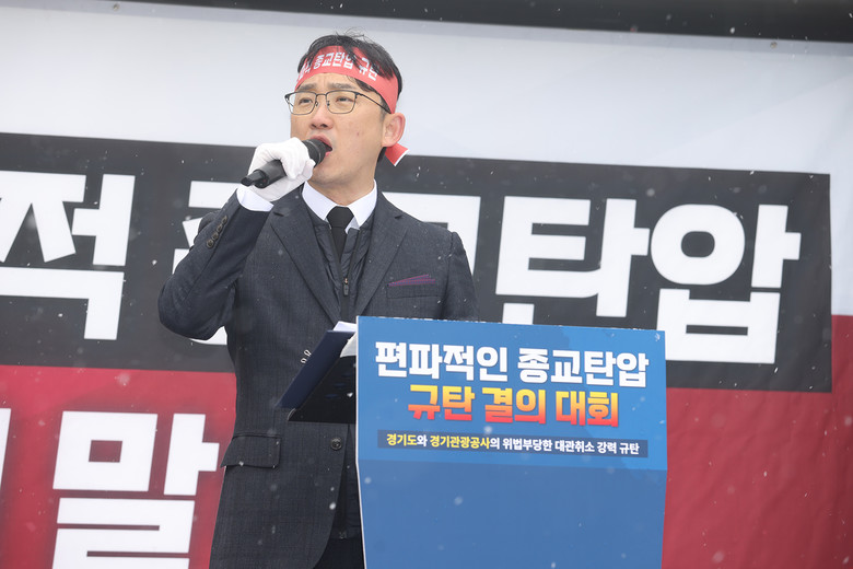 | ▲27일 경기도 수원시 장안구 경기관광공사 앞에서 ‘편파적인 종교탄압 규탄 결의대회’가 열린 가운데, 이기원 요한지파장이 개회사를 하고 있다. |